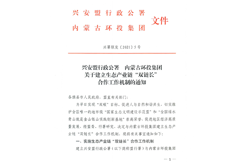 2021年9月25日,与兴安盟行署确立生态产业链“双链长”工作机制,标志着全国首例生态环境产业链“双链长”制在内蒙古诞生