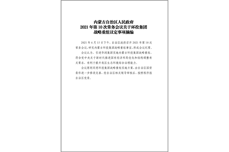 2021年6月10日,自治区政府组织召开第10次常务会议,研究通过《内蒙古环保投资集团有限公司战略重组方案》