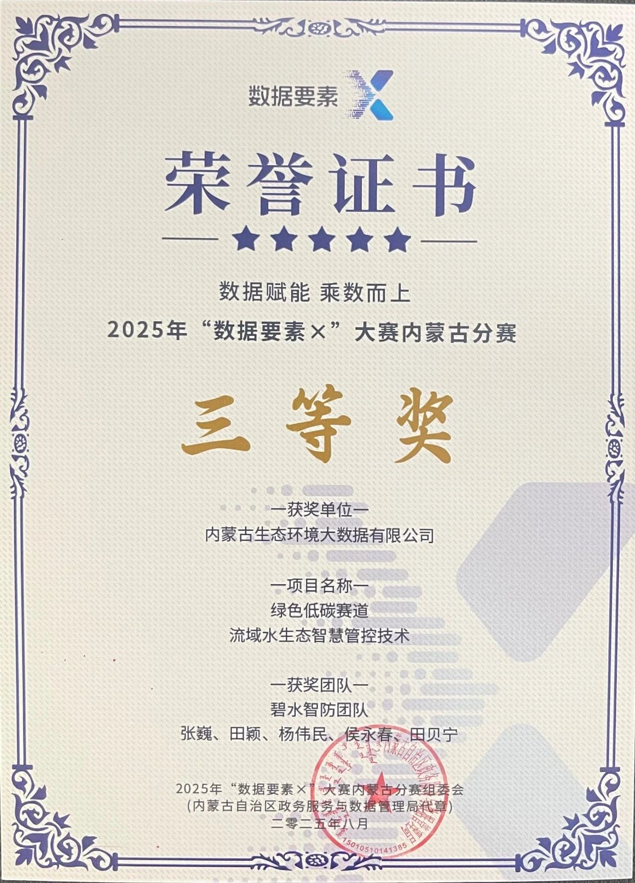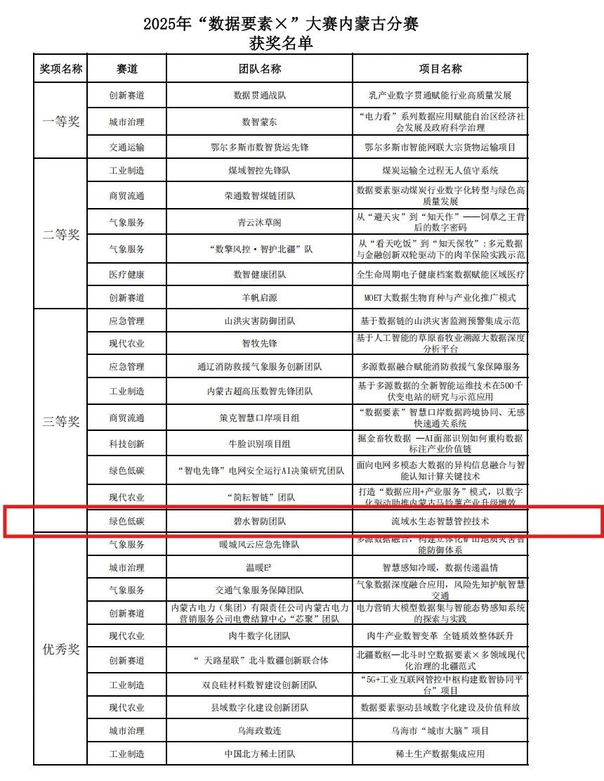 在国家数据局的指导下,由内蒙古自治区政务服务与数据管理局等13个部门联合主办、自治区大数据中心承办的2025年“数据要素×”大赛内蒙古分赛决赛,于8月14日在鄂尔多斯市圆满收官。由内蒙古生态环境大数据有限公司组建的“碧水智防团队”申报的《流域水生态智慧管控技术项目》,凭借其在水生态数据整合、智能分析与精准管控方面的创新成果,从众多参赛项目中脱颖而出,荣获三等奖。充分展现了该项目在数据要素赋能流域水生态治理领域的技术实力和应用价值。
